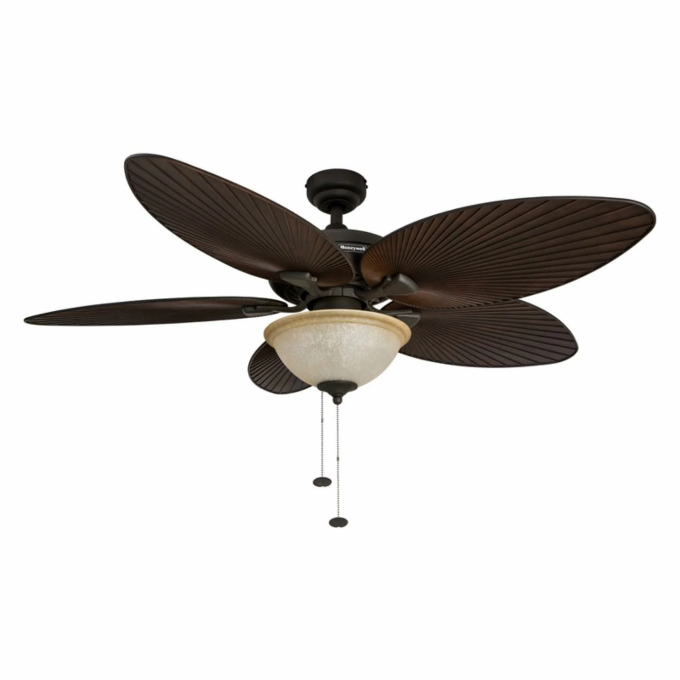 The Honeywell Palm Island 52 in. Ceiling Fan with Bowl Light features graceful elliptical blades with ridges for a unique coastal feel. With a 12-degree angle of pitch, this fan is ideal for a living room or family room. The three-speed motor is reversible. When your fan arrives, you can choose from three included mounting options. The stately sunset glass shade is bowl-shaped and conceals fittings for three 40-watt bulbs. Metal parts are dressed in an oiled bronze finish.
