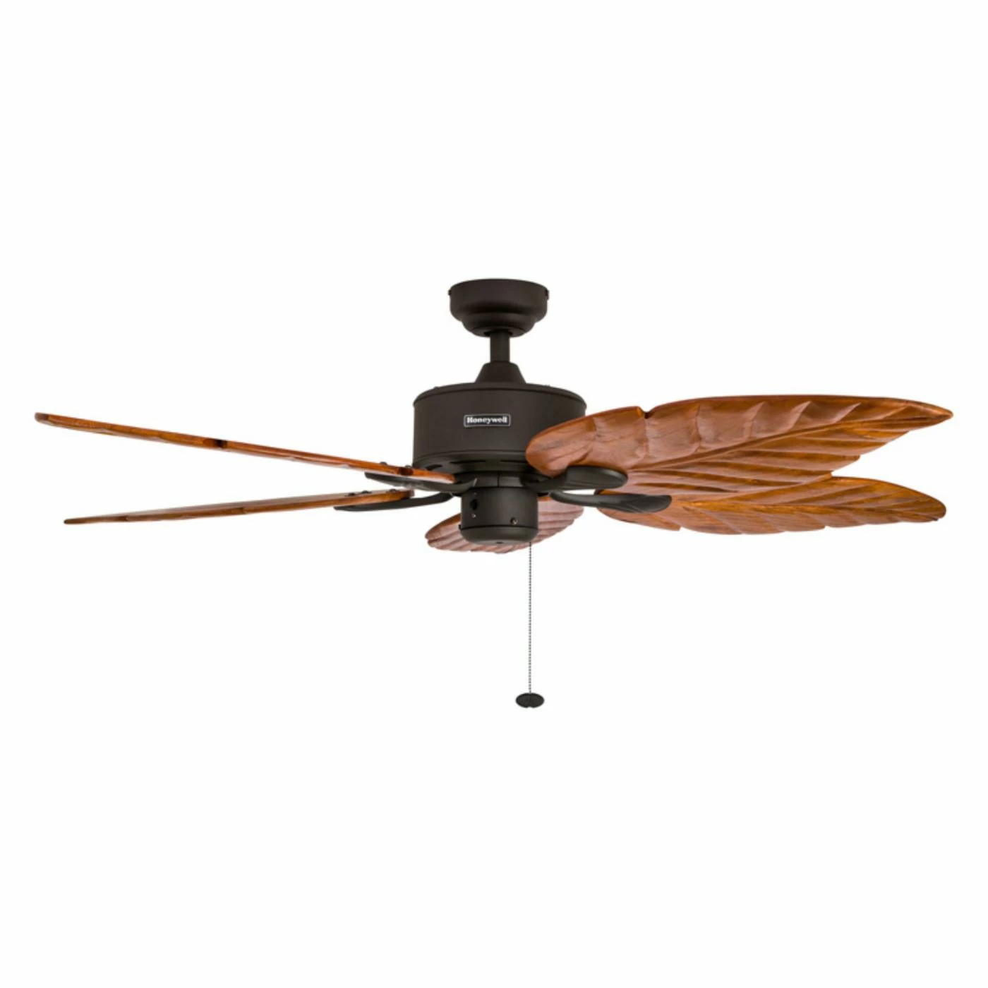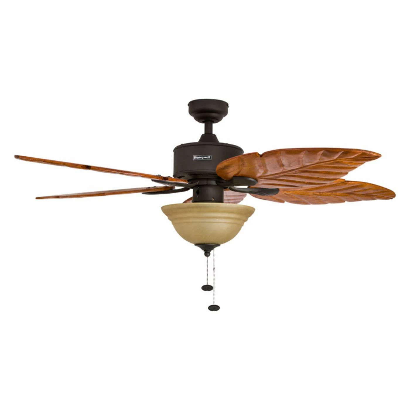Add a fresh breeze and a touch of coastal sophistication to any room with the Honeywell Sabal Palm 52 in. Ceiling Fan. Palm-shaped carved wood blades send you into a chilled-out Bahama state of mind. Metal elements are drenched in a rich bronze finish, while the Tuscan sand glass bowl fixture covers three 40-watt bulbs. The 3-speed motor is very efficient and can be reversed seasonally for optimal circulation of warm air during the winter. This ceiling fan is covered by an impressive manufacturer’s limited lifetime warranty.