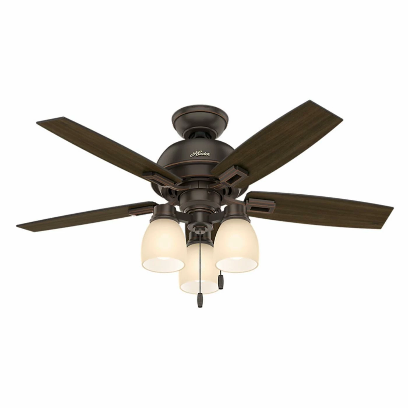 Rustic detail gives the classic Hunter Donegan 44 in. Indoor 3 Light Ceiling Fan traditional charm. The triple light fixtures illuminate the room and are dimmable to create the ambiance you want. The 44-inch blades make it compact enough for small rooms, yet the motor is powerful enough to cool larger ones. The variety of finishes ensures you’ll be able to effortlessly match it to your home’s dรฉcor.