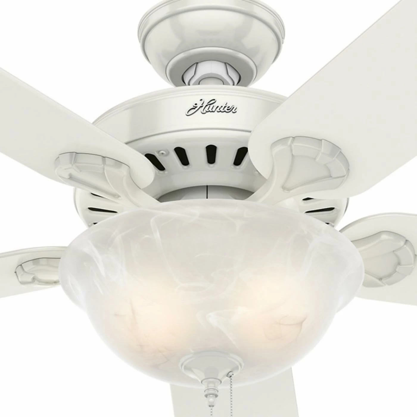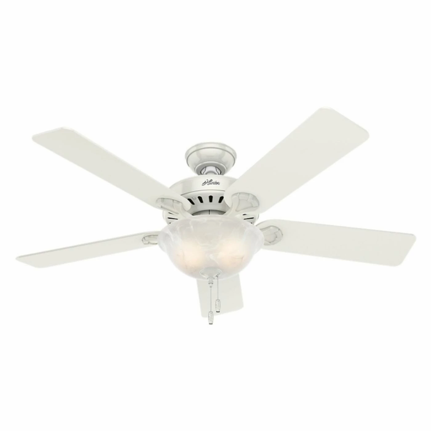 The Hunter Pro’s Five Minute 52 in. Indoor Ceiling Fan with Light is a breeze to install and offers whisper-quiet performance. This ceiling and light kit combo comes 90% pre-assembled right out of the box, which makes it quick and easy to install. It has a classic design with five reversible blades and comes in select finish options. Its elegant swirled marble bowl glass shade diffuses light and it includes two energy-efficient CFL bulbs. The handy pull chain makes it easy to adjust the three fan speeds or turn it on and off.