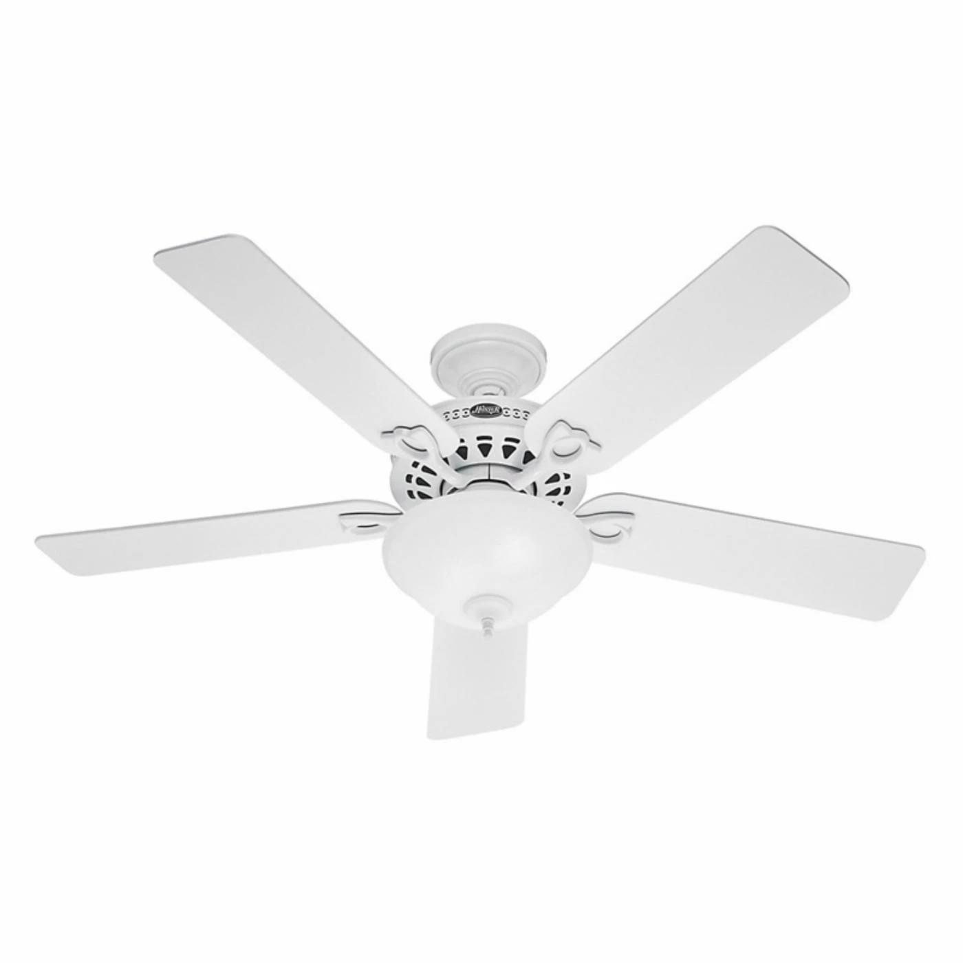 Simple elegance and whisper-quiet operation make the Hunter The Astoria 52 in. Indoor Ceiling Fan with Light ideal for your room. A handsome ceiling fan and light kit combo, this one is made of the finest materials and features a classic housing plus five reversible blades that come in select finish options. The frosted glass shade beautifully diffuses light while the pull chain makes it a breeze to adjust the speed and turn the ceiling fan and light on or off.