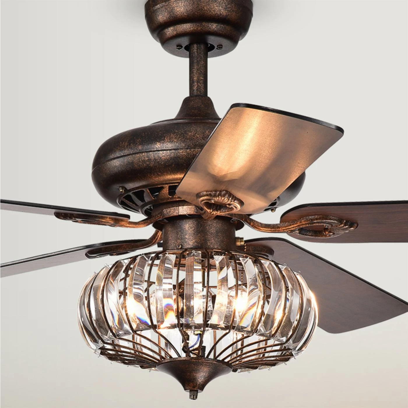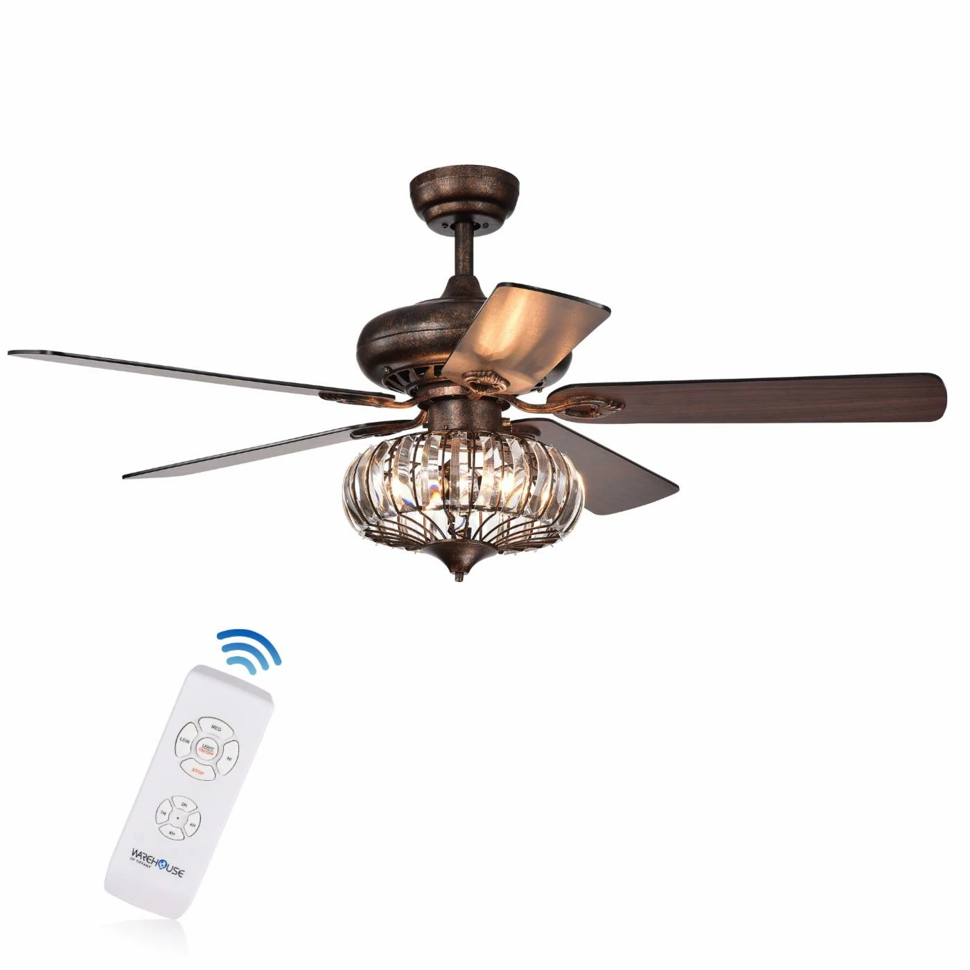 Update your home’s lighting with the casual elegance of the Warehouse of Tiffany Vasilisa 52 in. Indoor Ceiling Fan with Light. The blending of styles and functions offers the perfect solution for those who enjoy the cooling of a ceiling fan without sacrificing light. Its reversible three-speed fan provides year round comfort by offering your choice of available pull chain or remote controlled operation. Faceted crystals display the warm glow of the single-bulb housing with eye-catching sparkle. The rich bronze finish and wood blades give this fan and light combination an inviting feel which will blend right in with your decor.