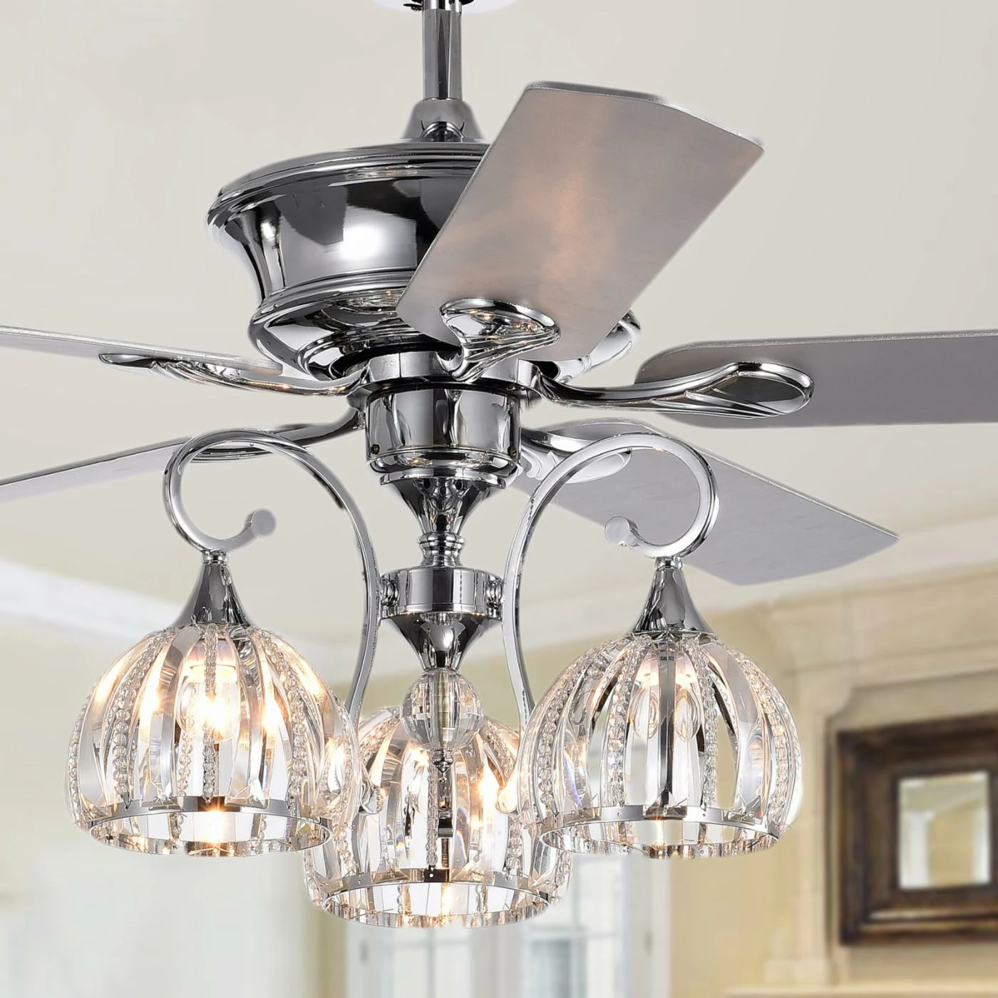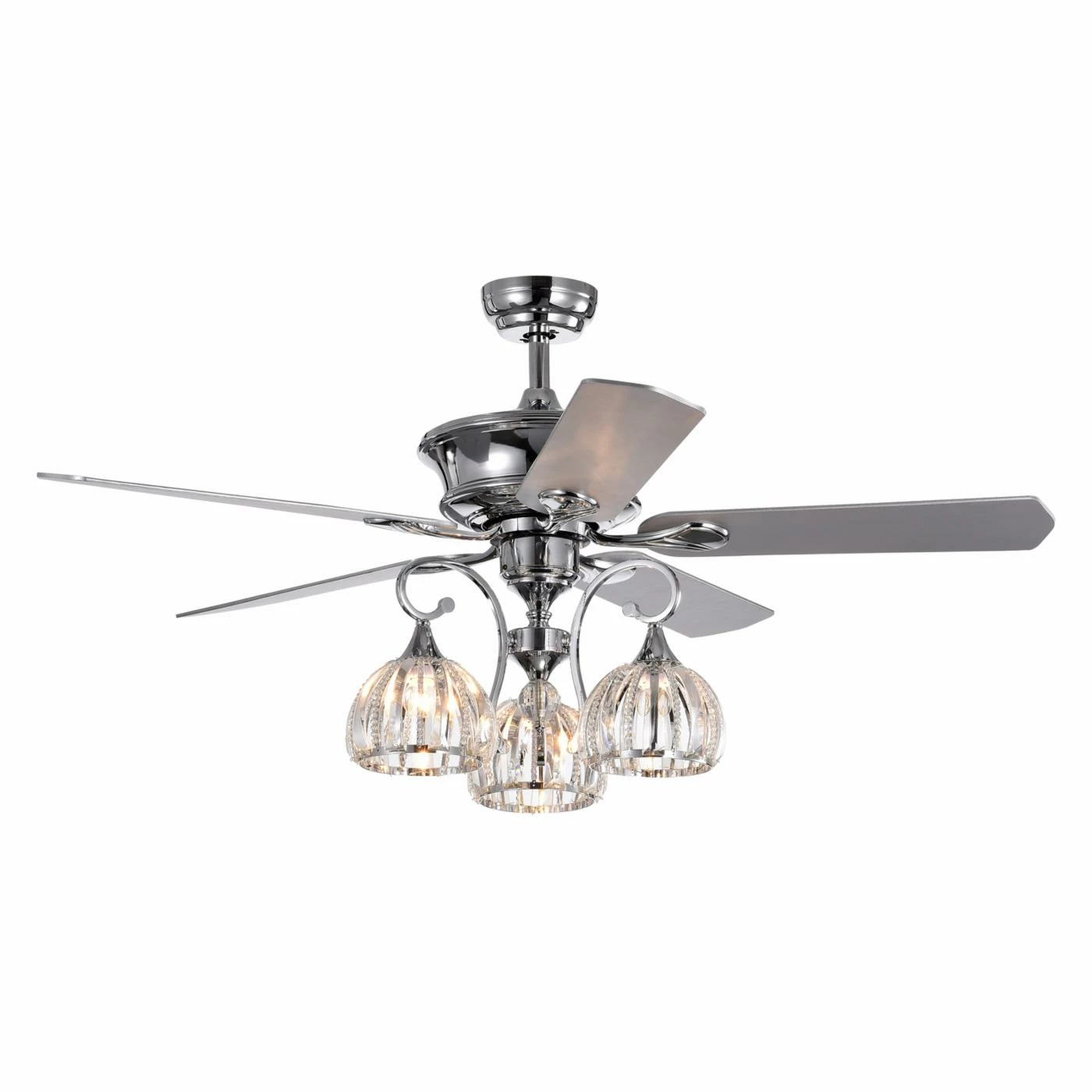Gentle curves and a mix of faceted crystals and beads give the Warehouse of Tiffany Mavyn 52 in. Indoor Ceiling Fan with Light a simple, yet elegant look. It’s dual-functionality is the perfect solution for those who want the comfort of a ceiling fan without sacrificing luxury. The three-speed fan offers customizable air circulation while helping reduce cooling costs. Choose from the available pull chain or remote control options to discover the convenience, comfort, and beauty this fan and light combination has to offer.