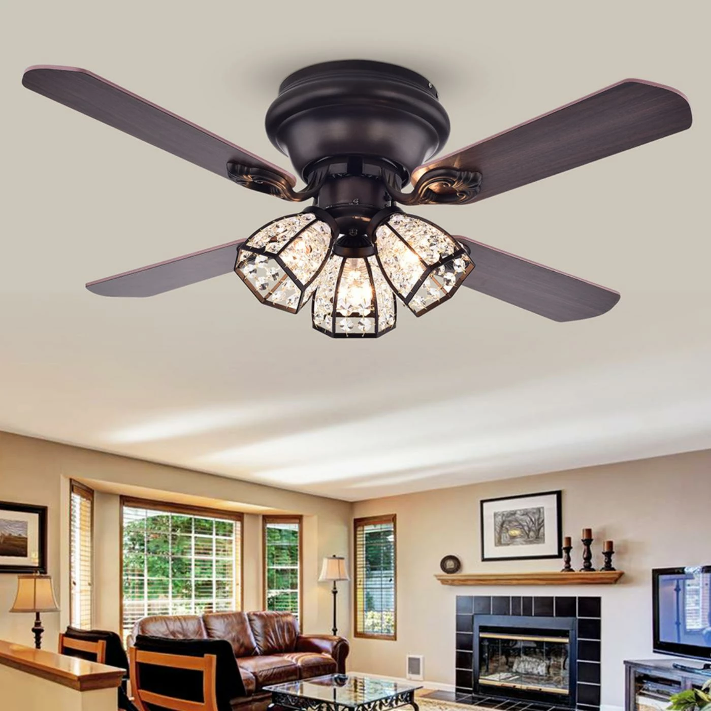 The Warehouse of Tiffany Tarudor 42 in. Indoor Ceiling Fan with Light features an updated look to traditional styling by featuring crystal-embellished shades and an antique bronze finish. The flush-mount design boasts a simple fan housing with sculpted blade brackets for added detail. The three-speed fan is reversible to keep you cool in the summer and cozy when it’s chilly. Your choice of available pull chain or remote controlled operation offers added convenience and wiring versatility.