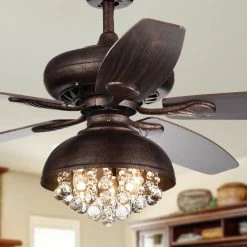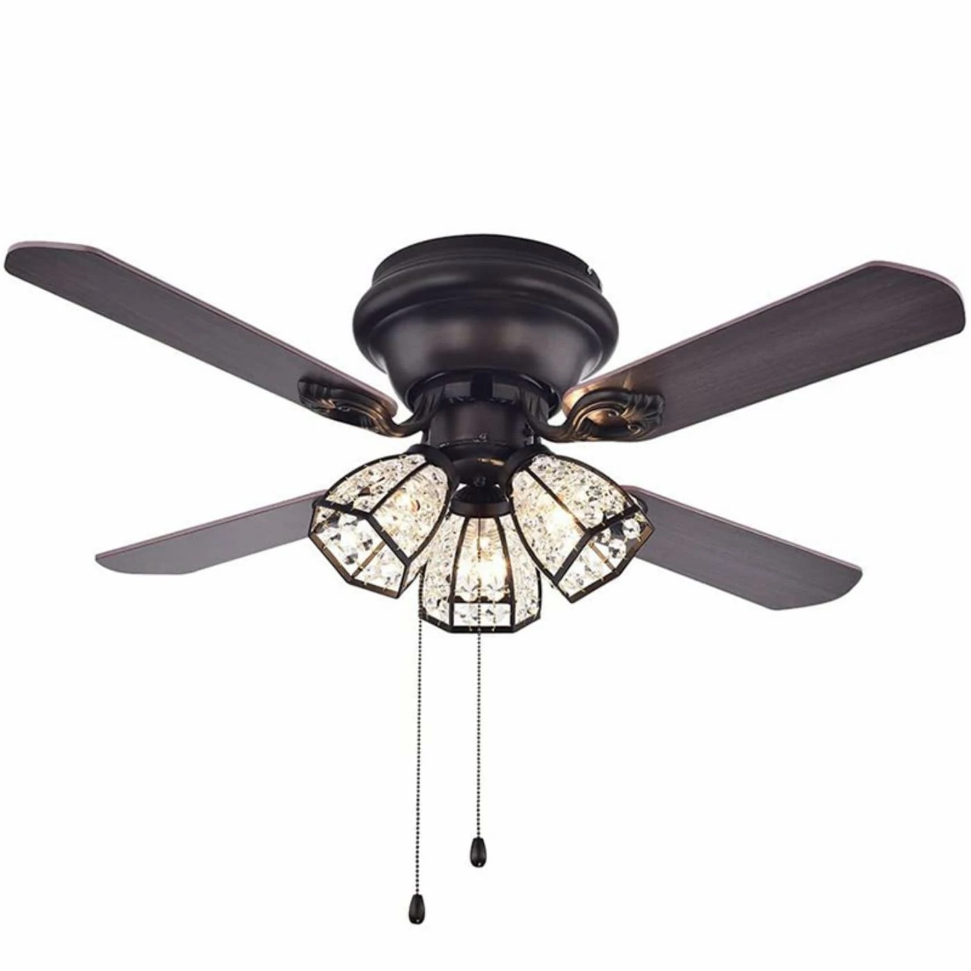 The Warehouse of Tiffany Tarudor 42 in. Indoor Ceiling Fan provides your room with a gorgeous upgrade from your standard ceiling fan. This kit features a wide, base with an antique bronze finish. An included light kit provides plenty of illumination and features ornate glass shades. Wide paddle blades provide plenty of circulation. The blades are crafted from wood with an appealing deep brown finish. The three-speed motor and lights are controlled via double pull chains. Professional installation is recommended.