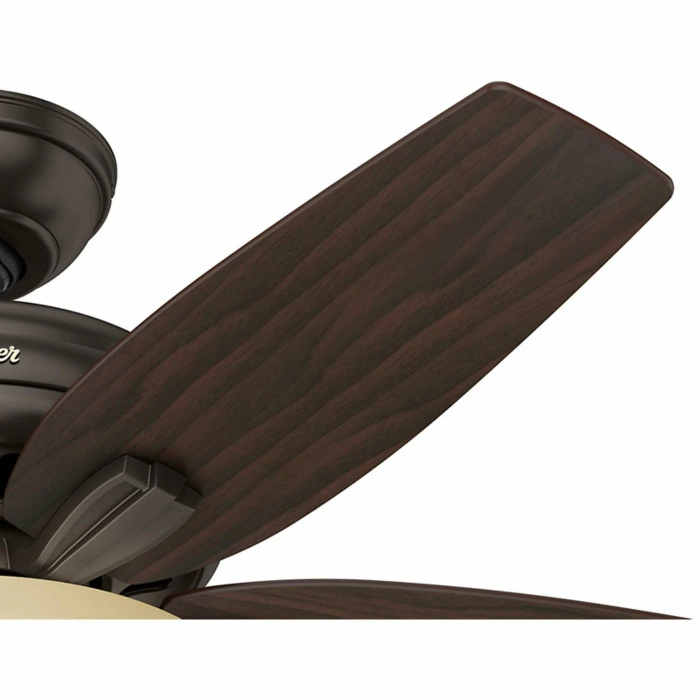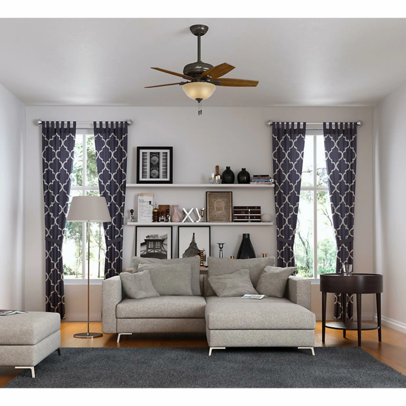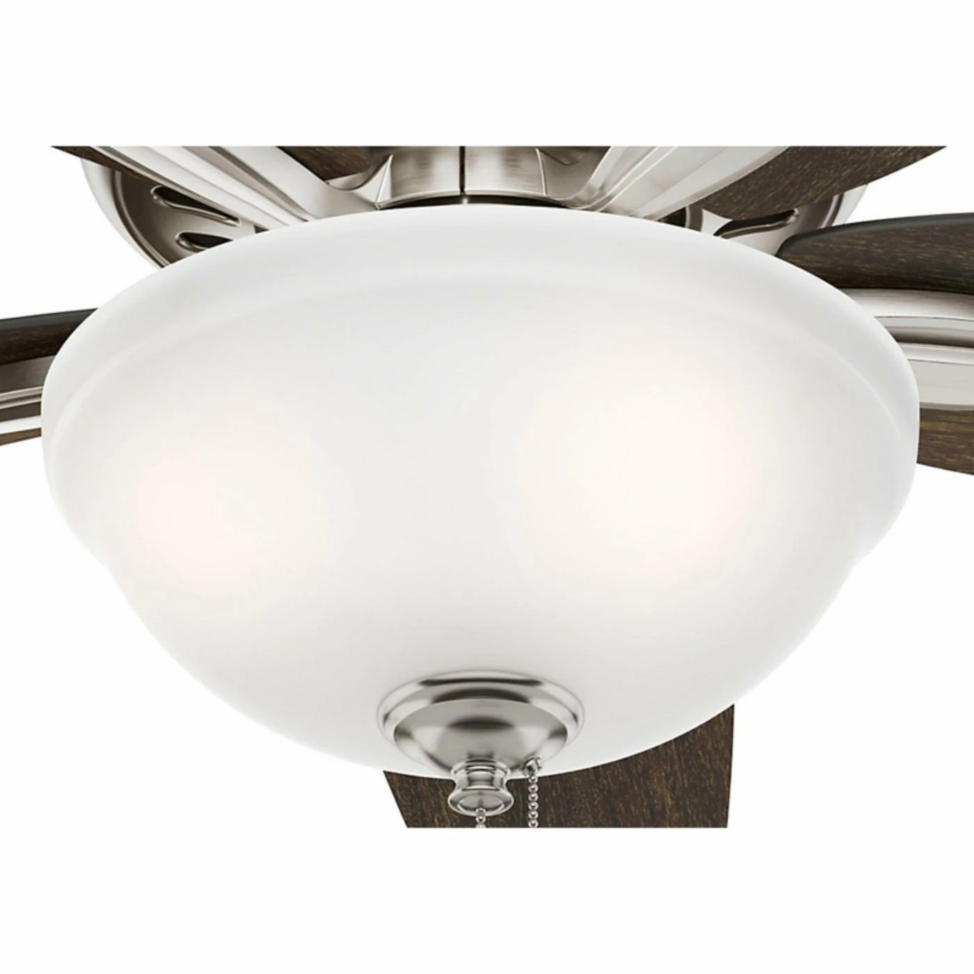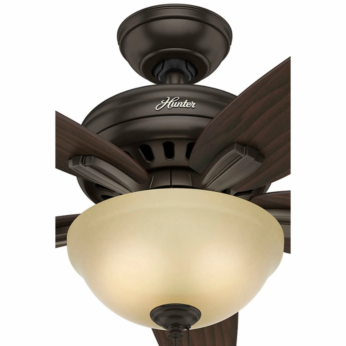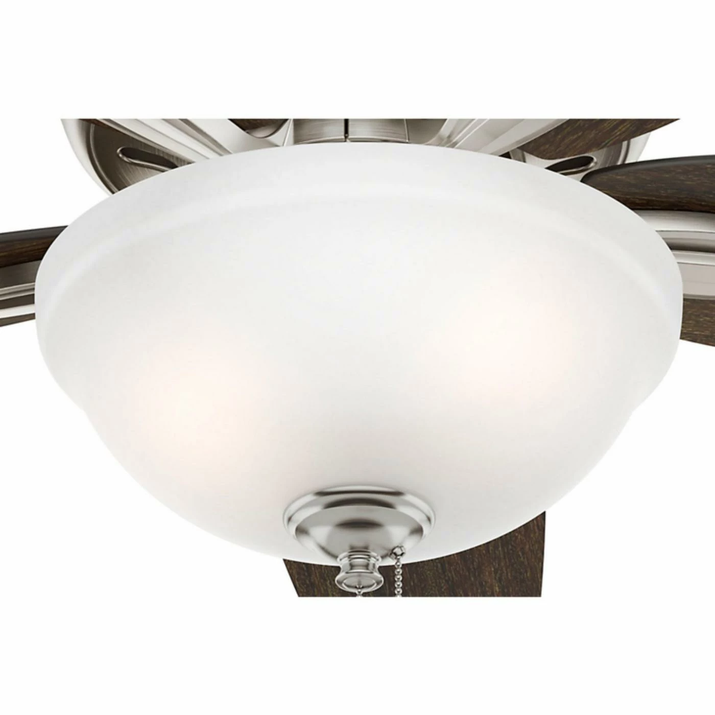Cool down and light up your space in style with the Hunter Newsome 51080 42 in. Indoor Ceiling Fan. Its traditional design comes in your choice of finish and a selection of light kits. This three-speed ceiling fan and light kit combo requires two bulbs (included).
