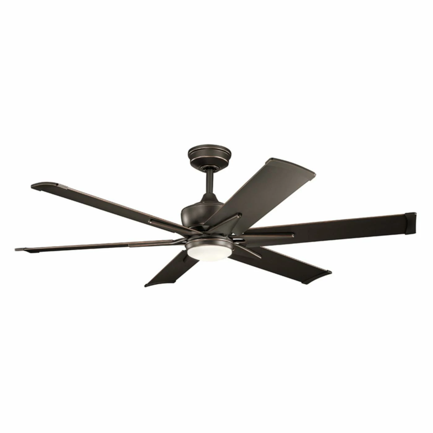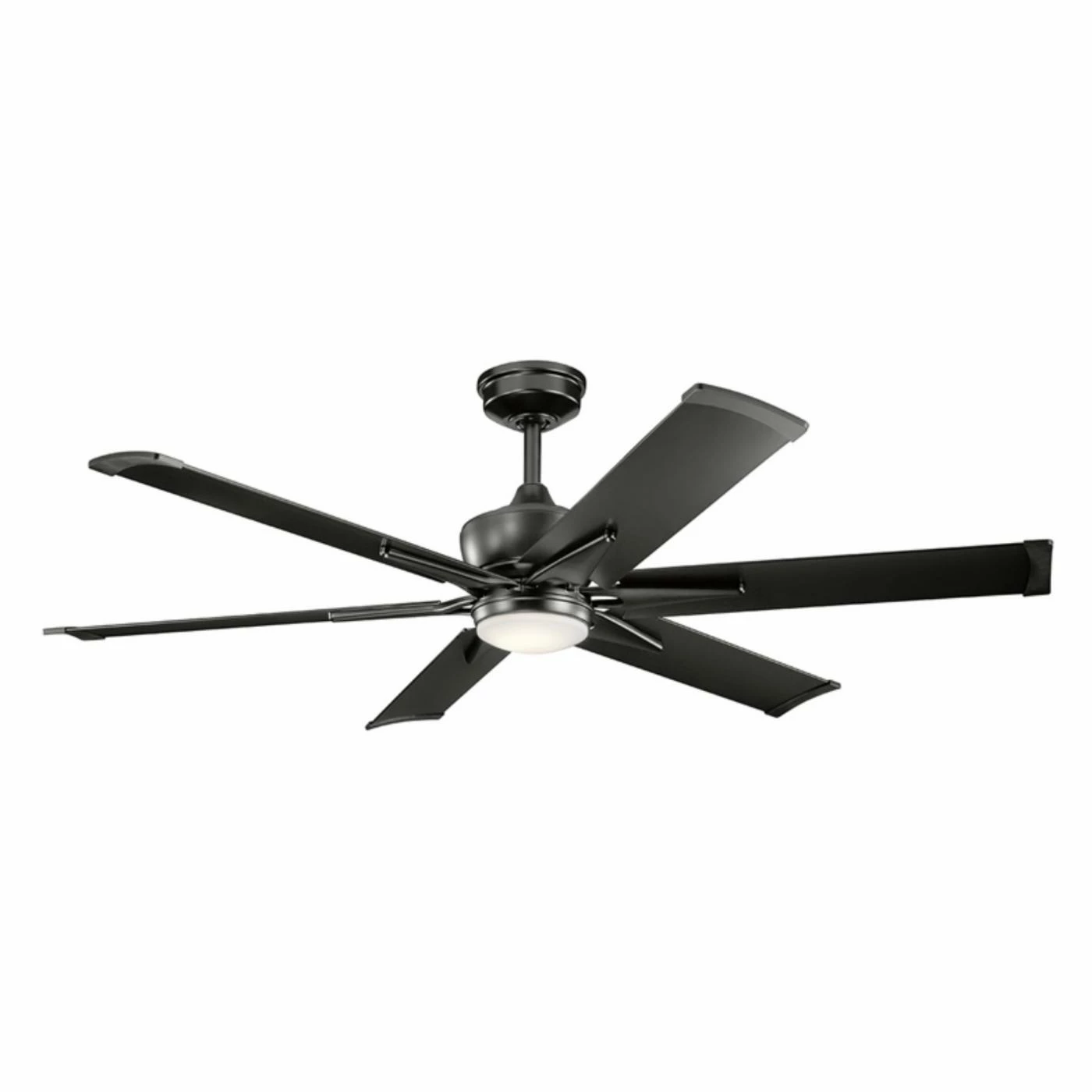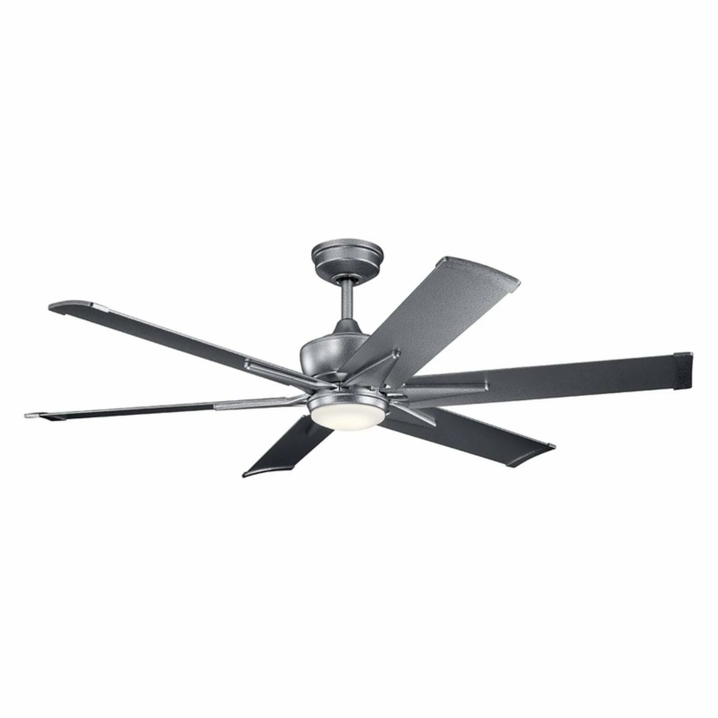 Lend some industrial-inspired design to your space with the Kichler Szeplo Patio Szeplo II 60 in. LED Indoor Ceiling Fan boasting an assortment of bold finishes in your choice of color. This large ceiling fan has unique triangular designs on each blade that give it a decidedly urban look. The smooth glass shade cradles an energy-efficient LED light to bring your home a bright glow paired with on-trend design, and weather-resistant options make it suitable for a porch or patio area.