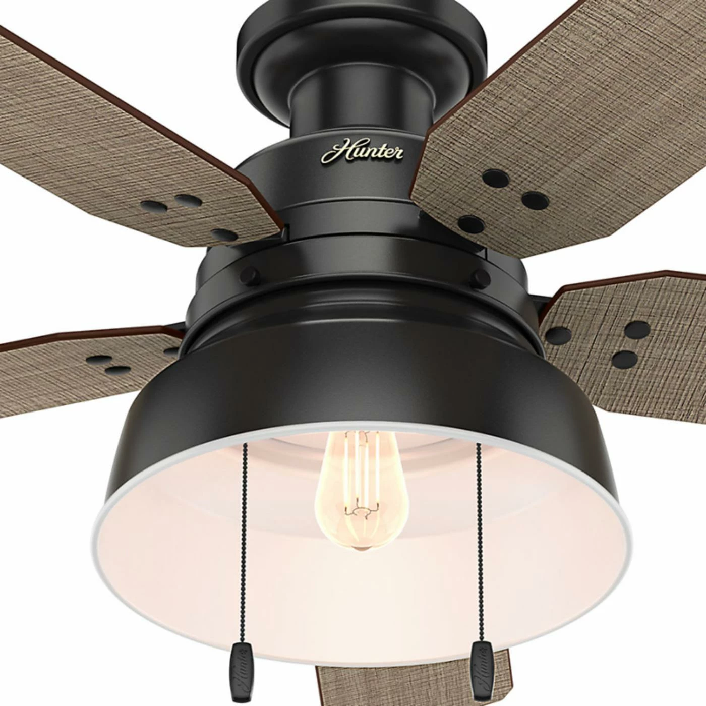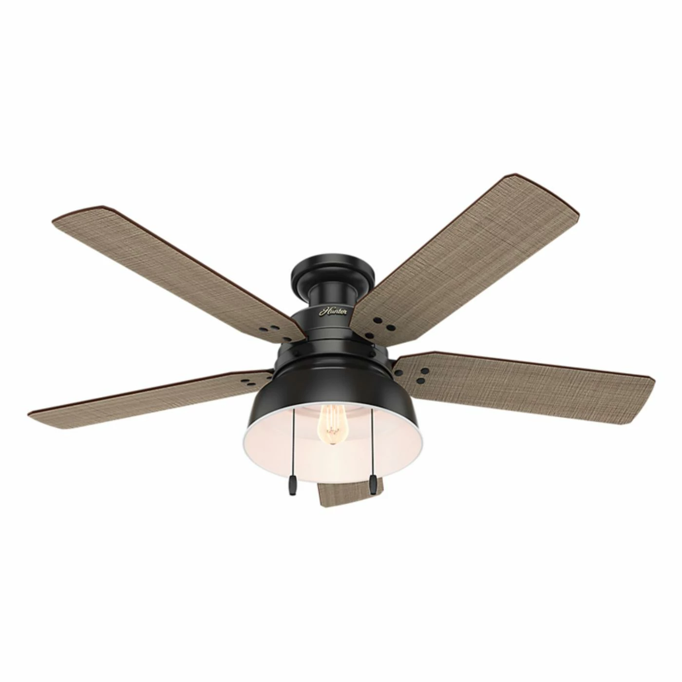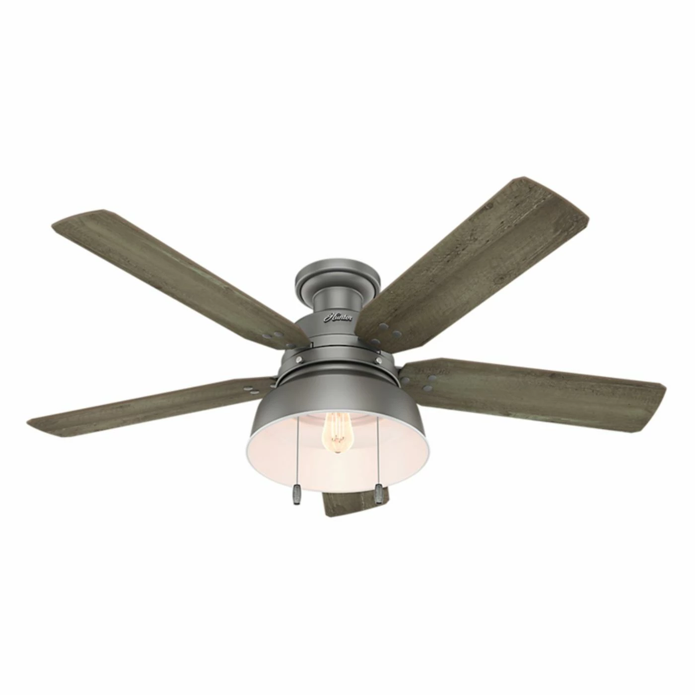 The Hunter Mill Valley 52-in. Flush Mount Outdoor Ceiling Fan with Light delivers rustic-industrial appeal, and is a fitting way to accent your casual farmhouse living space. Equipped with a flush mount, this fan is ideal for rooms with lower ceilings. This ceiling fan features vintage-inspired rivets that secure the blades, coin-edge thumb screws, a barn-style open hood light, and a single LED Edison bulb with a white hood reflector to maximize the emitted light.