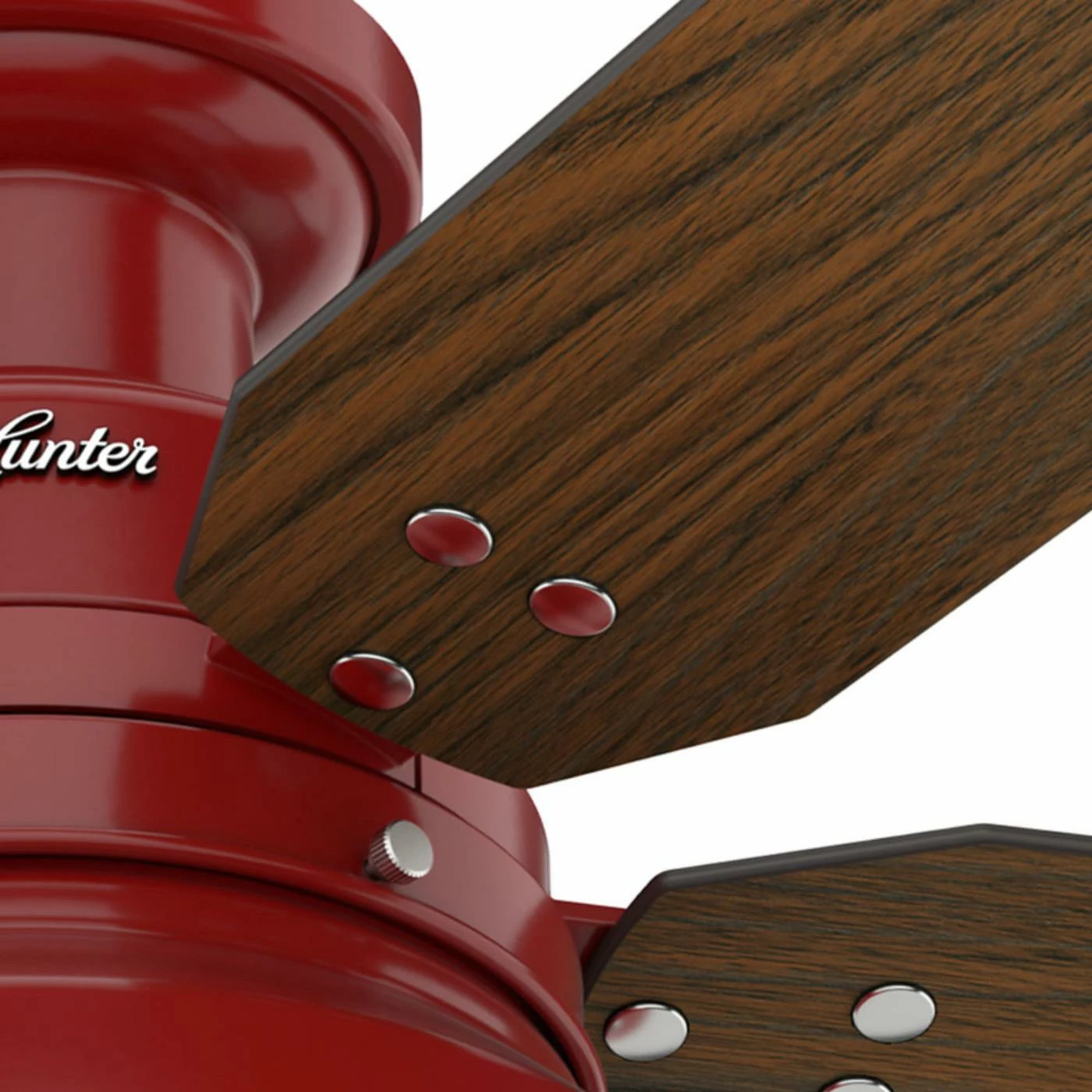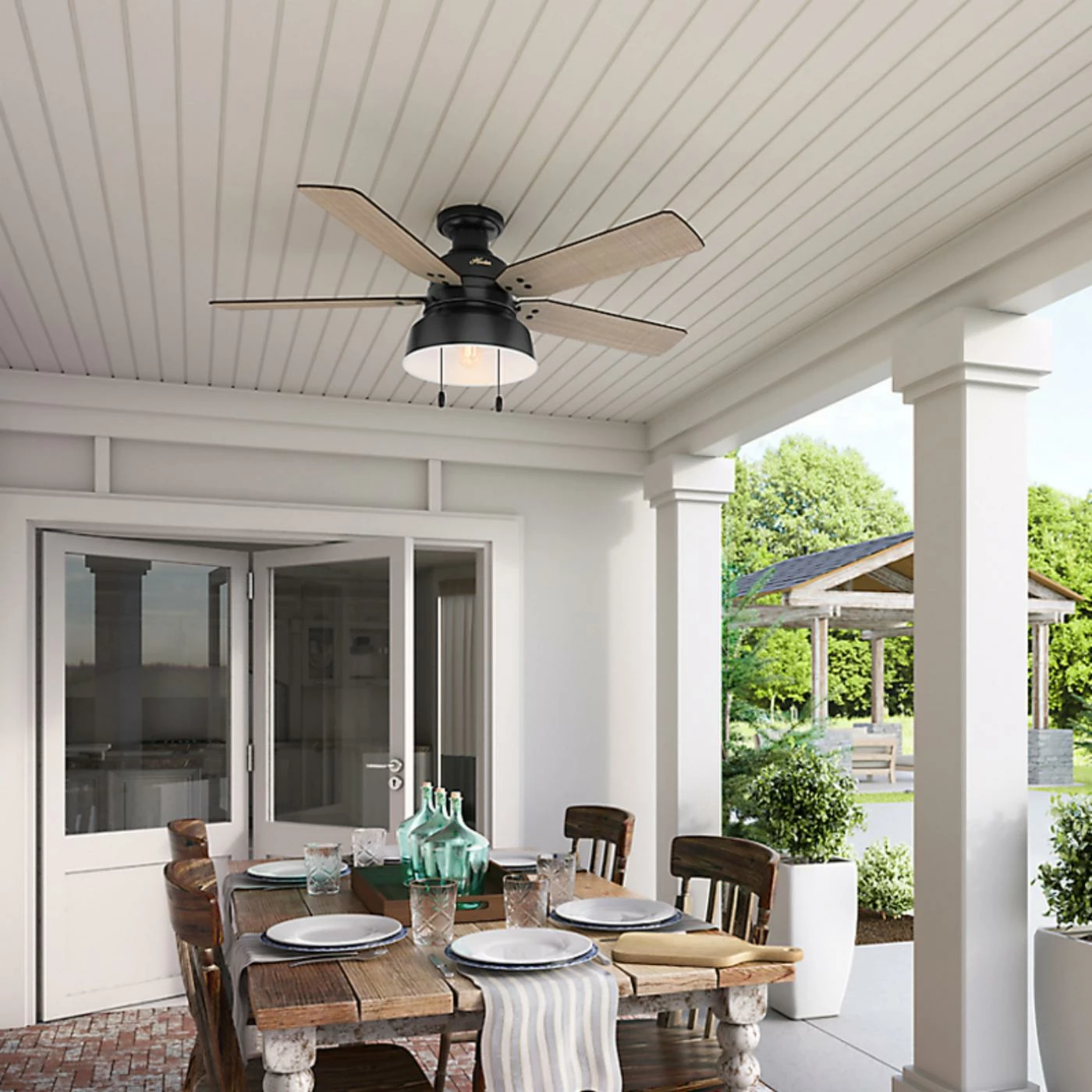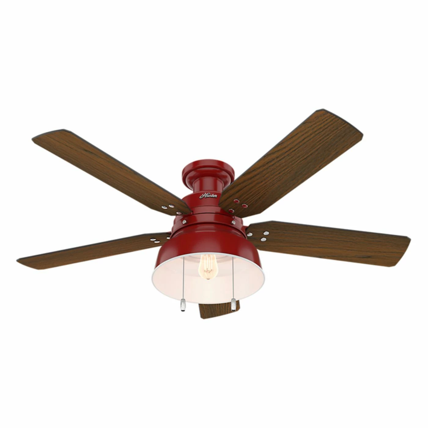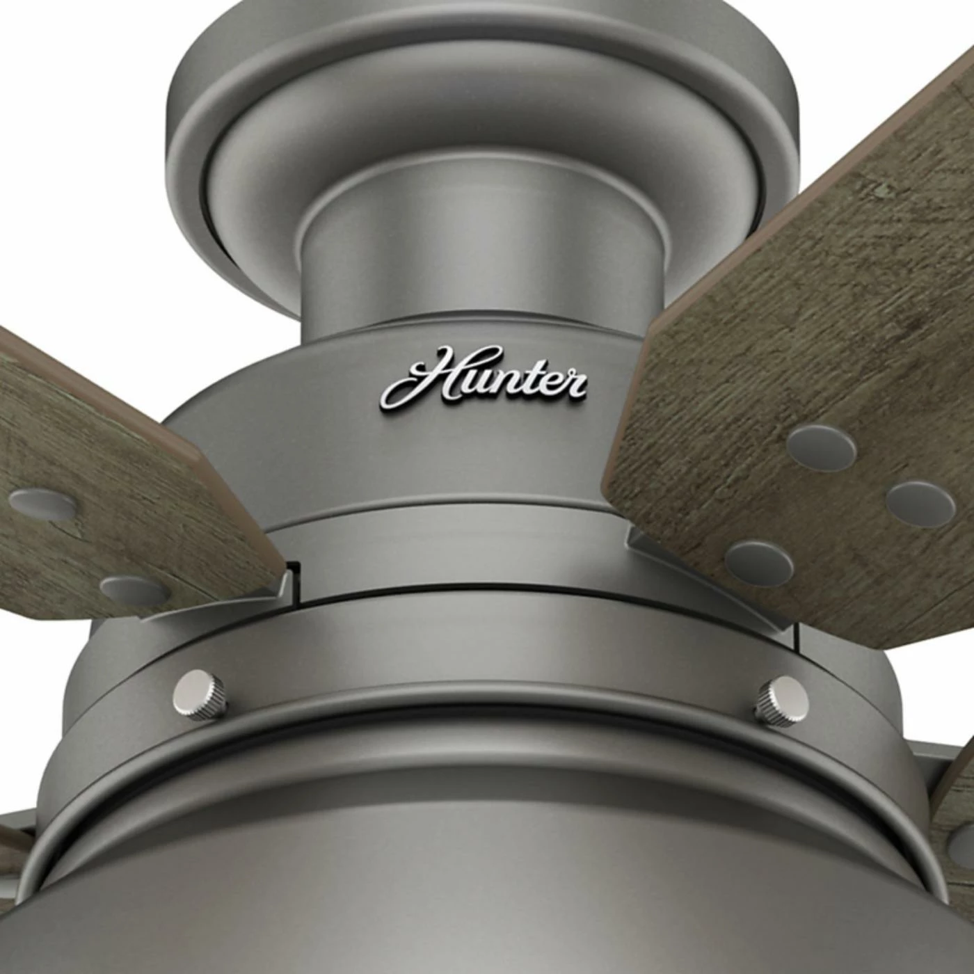 The Hunter Mill Valley 52-in. Flush Mount Outdoor Ceiling Fan with Light delivers rustic-industrial appeal, and is a fitting way to accent your casual farmhouse living space. Equipped with a flush mount, this fan is ideal for rooms with lower ceilings. This ceiling fan features vintage-inspired rivets that secure the blades, coin-edge thumb screws, a barn-style open hood light, and a single LED Edison bulb with a white hood reflector to maximize the emitted light.