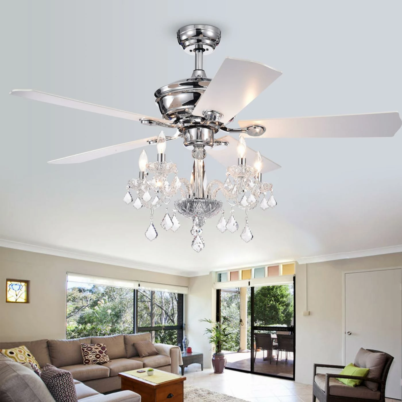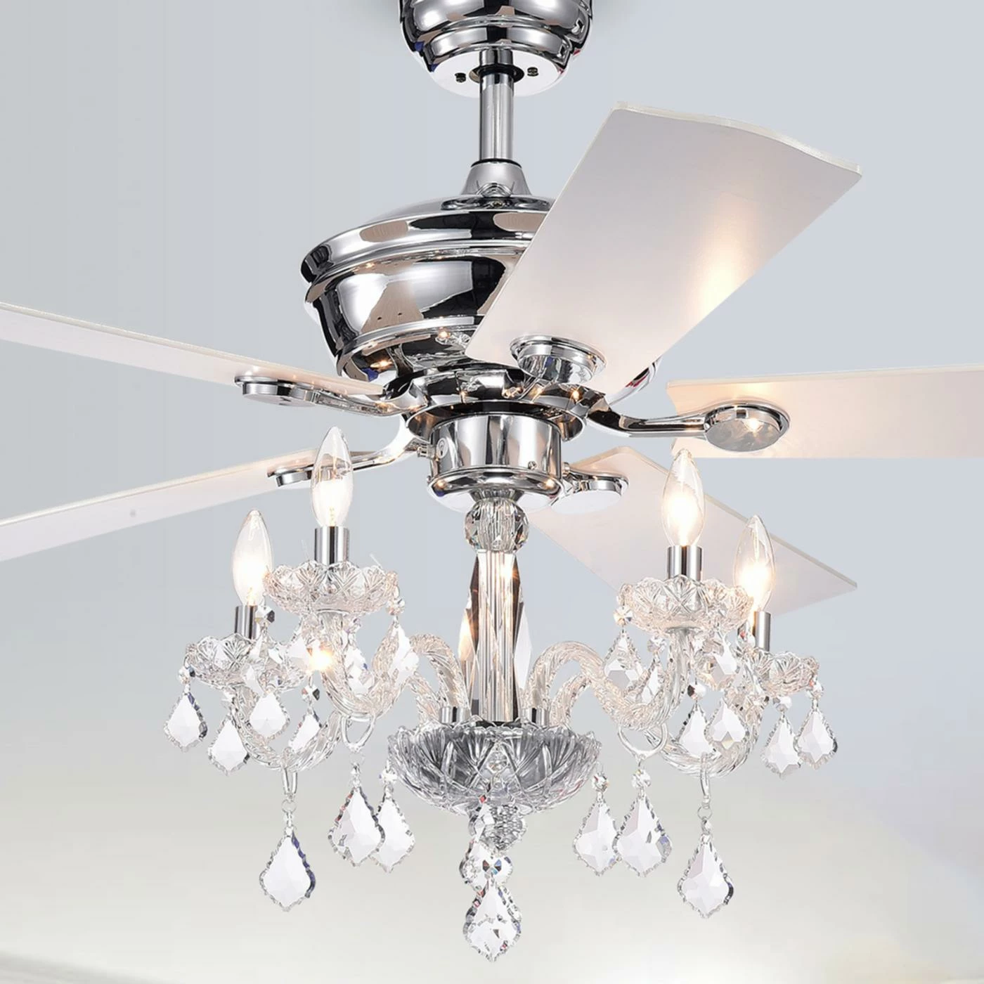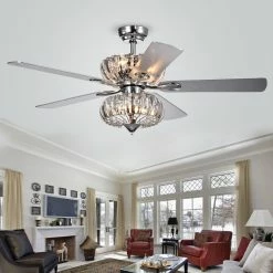 Give your home a glamorous look with the sparkle and glowWarehouse of Tiffany Havorand III 52 in. Indoor Ceiling Fan with Light. The chrome-finished fan housing features simple styling which gives way to an elegant crystal chandelier. A convenient remote control operates the three speed motor for customized air circulation. Beneath the fan, you’ll discover a five-light housing detailed with a myriad of sculpted edges, faceted pendants, and graceful curves. It’s a dual-purpose fixture that offers a warm glow and ambiance while keeping you comfortable throughout the year.